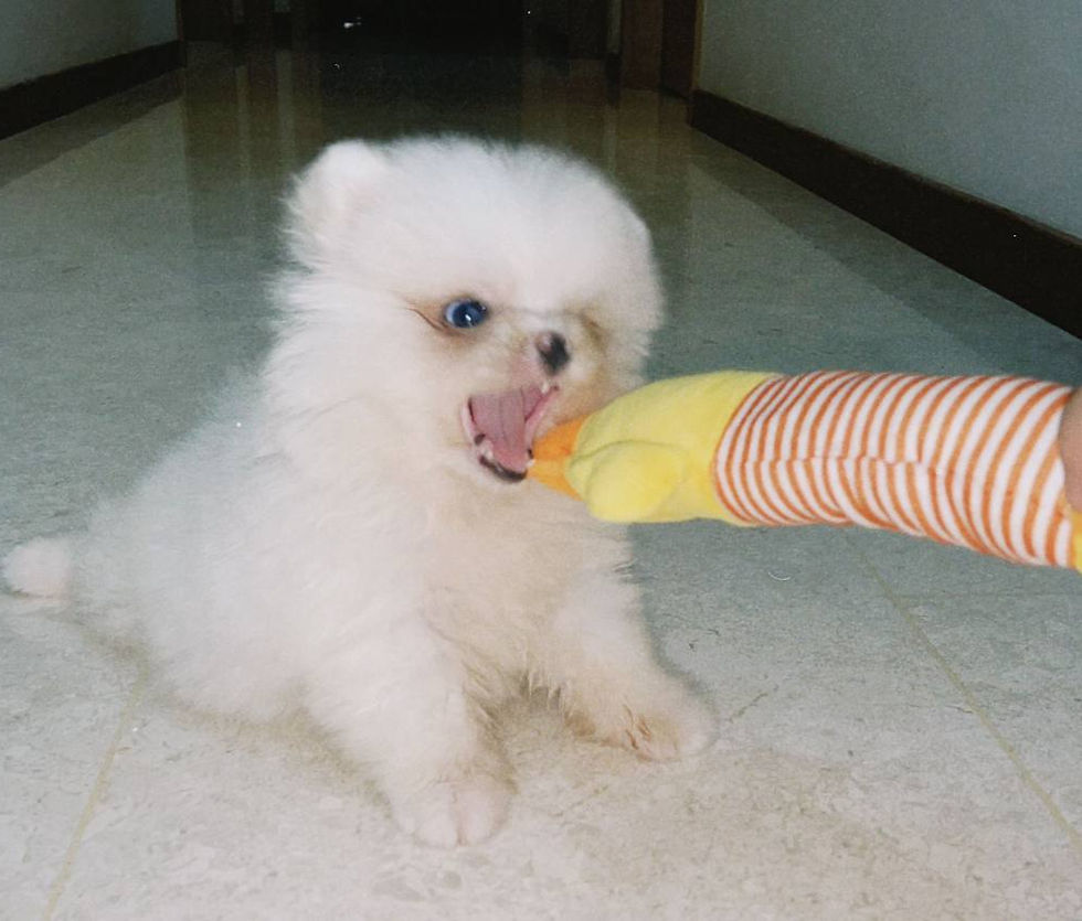 However, as time passed, Mantou grew into an incredibly sociable and affectionate dog. He would beam with excitement whenever he saw any of us, dashing over eagerly for attention. One of my favourite ways to play with him was tug-of-war using his toys, and he would bite down on it so stubbornly that he refused to let go. At times, his grip was so firm that I could pull him across the floor for quite a distance, making him look almost like a tiny vacuum cleaner trailing behind his toy.